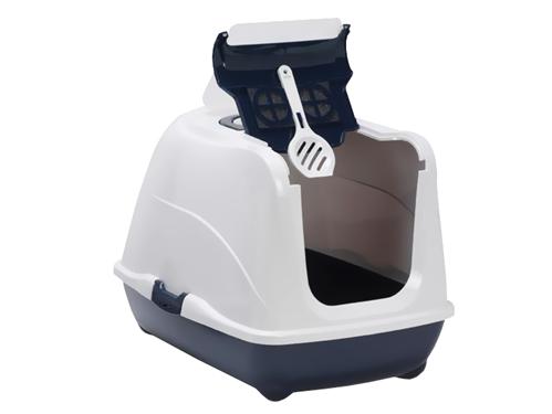 Includes one charcoal filter to help reduce odors, a translucent door for added privacy and a slotted litter scoop conveniently stored inside.